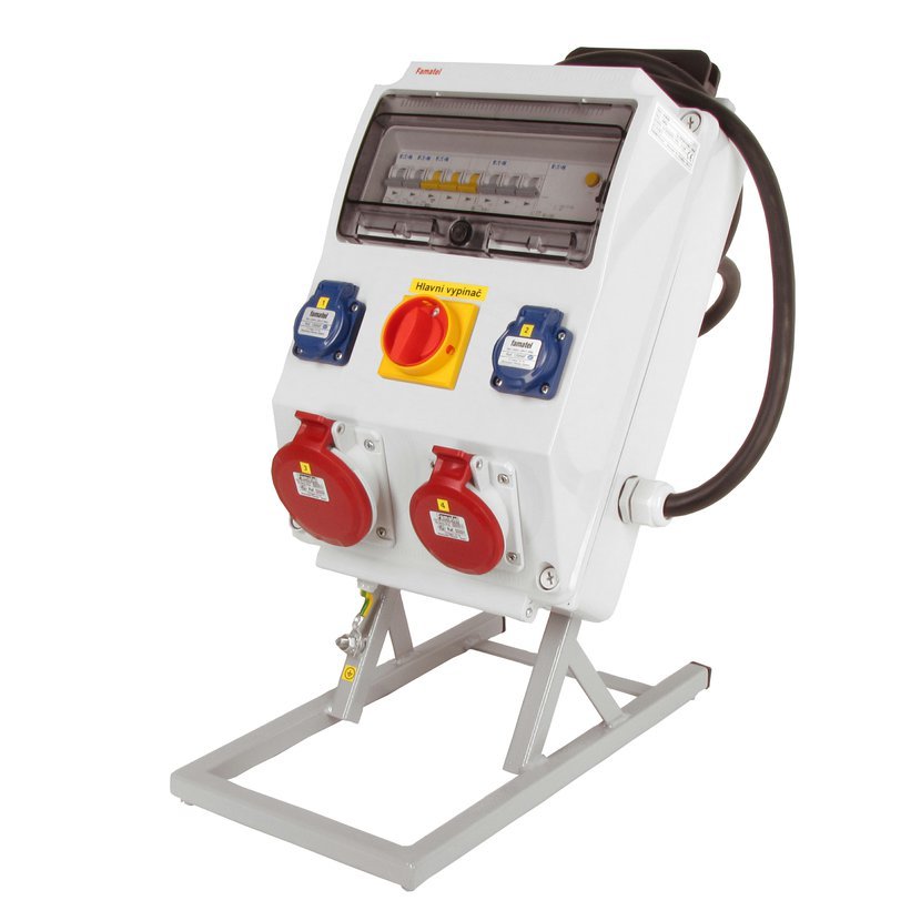 Baustromverteiler (Niederspannungs-Unterschaltanlage) FAMATEL v31027_DE mit LS-Schalter abgesichert, mit FI-Schutzschalter 40/4/003 und Hauptschalter 40A auf Metallständer, IP54,